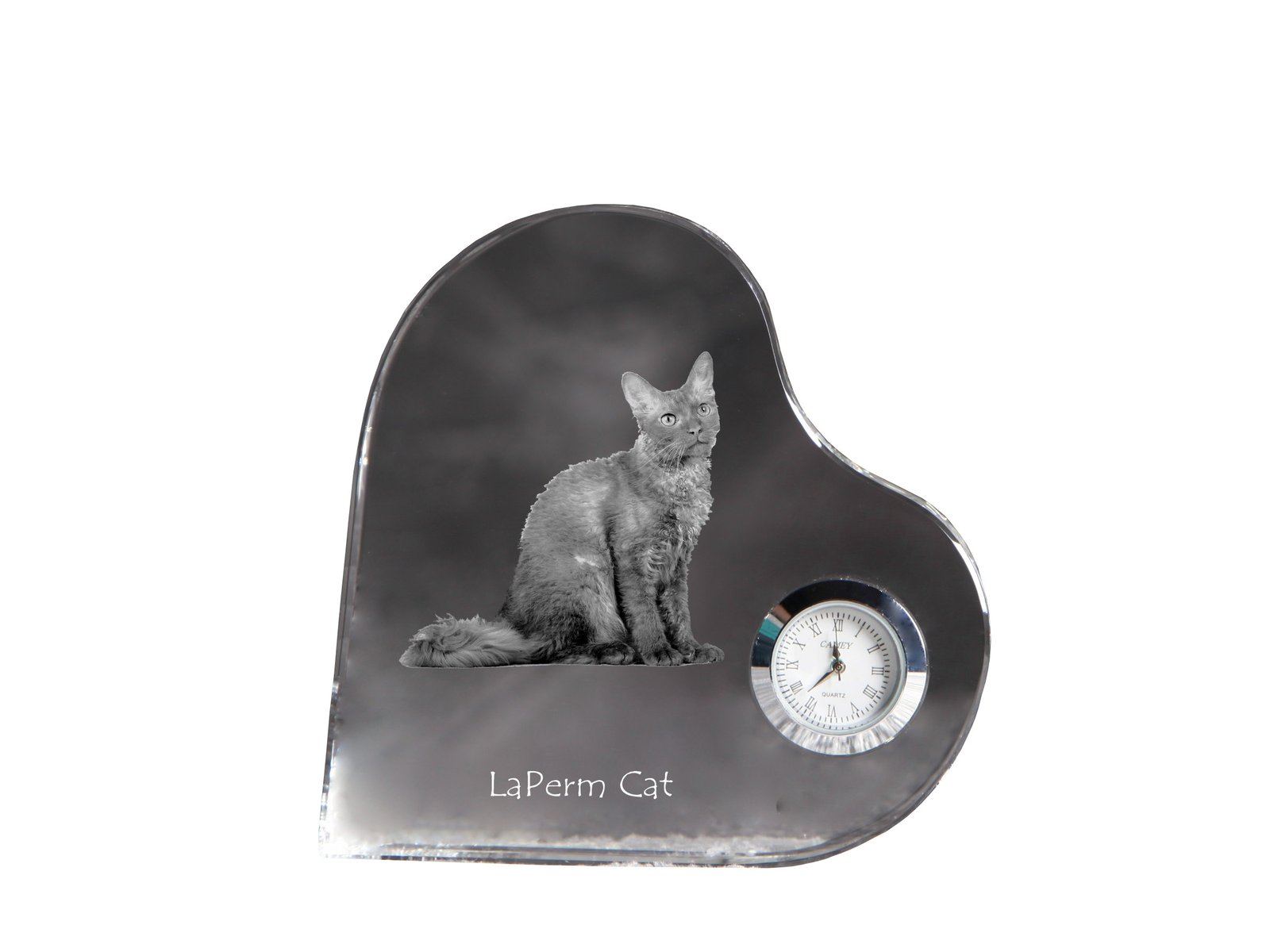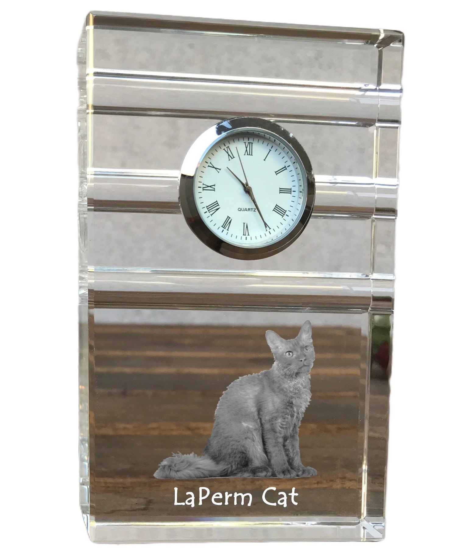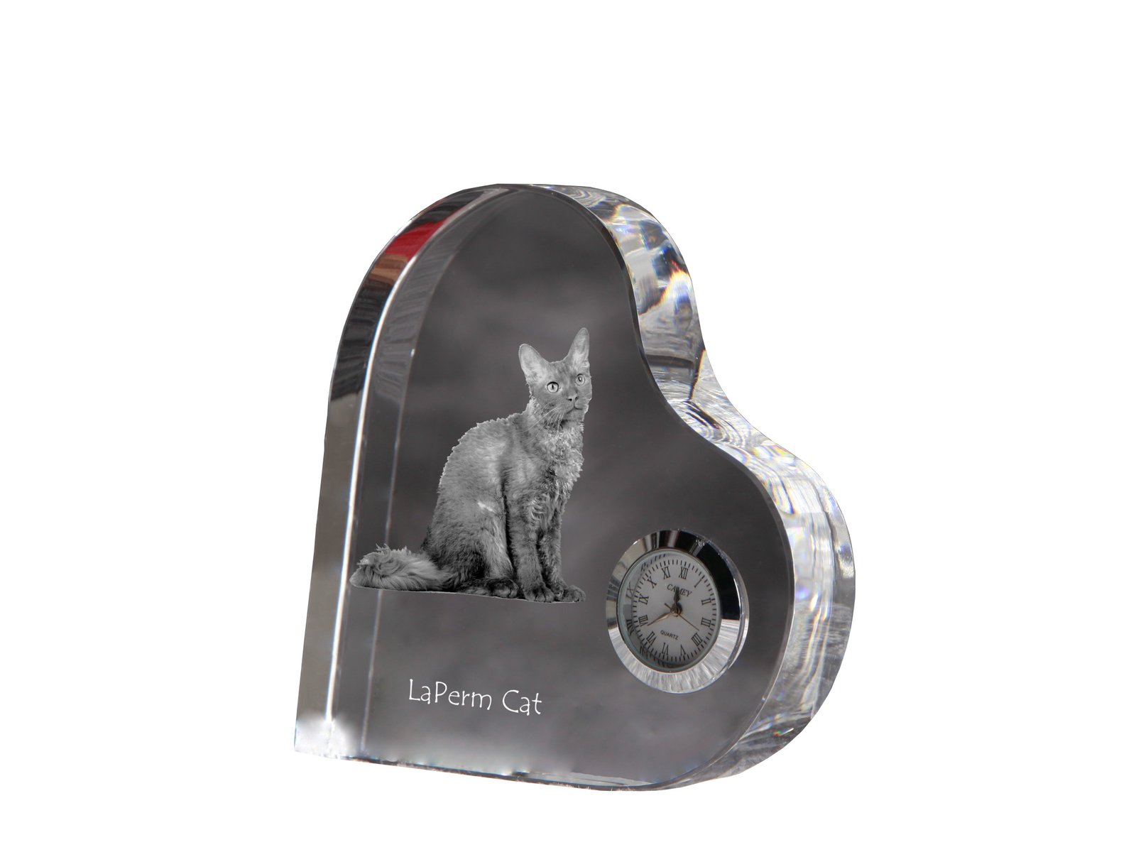 Lapermas (LaPerm) – Krištolo laikrodis su katės nuotrauka