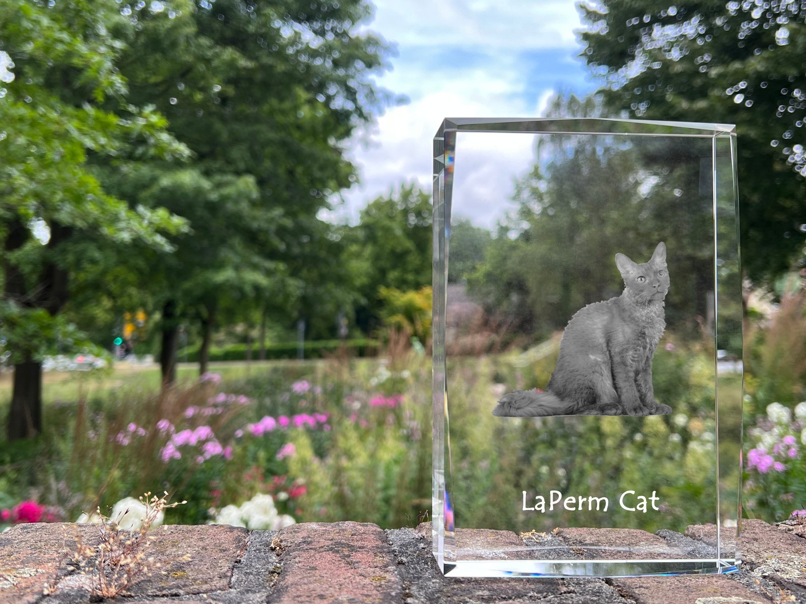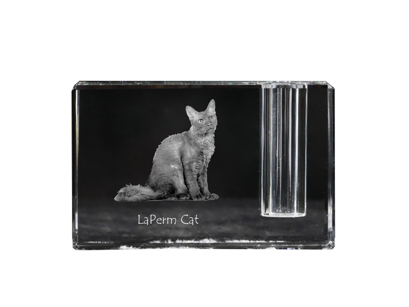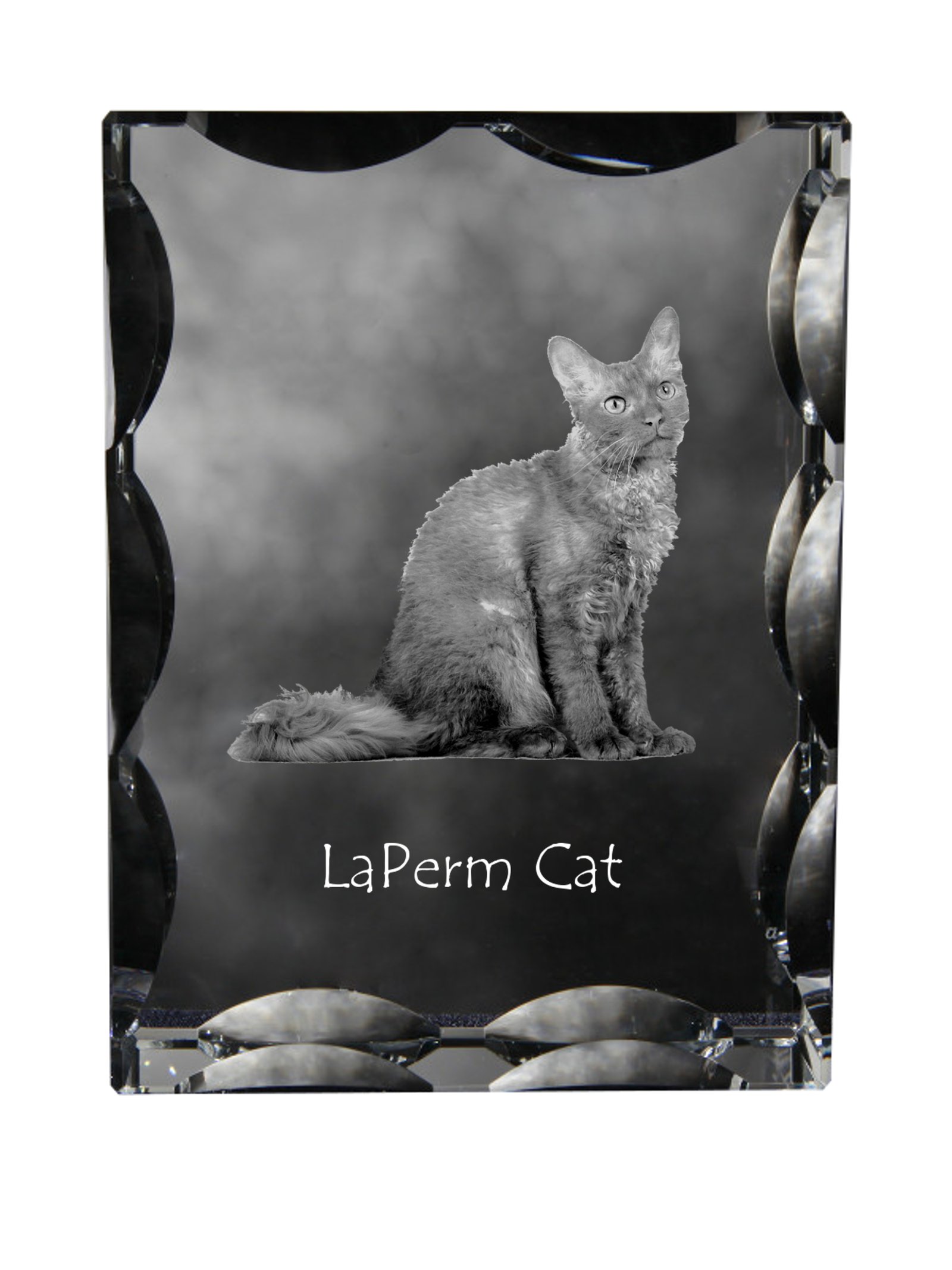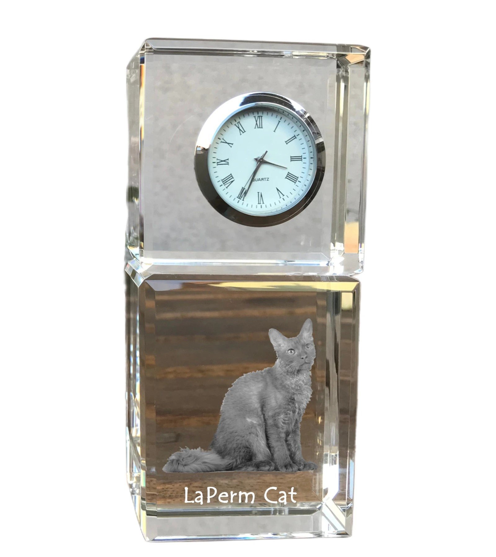 Lapermas (LaPerm) – Krištolo laikrodis su katės nuotrauka