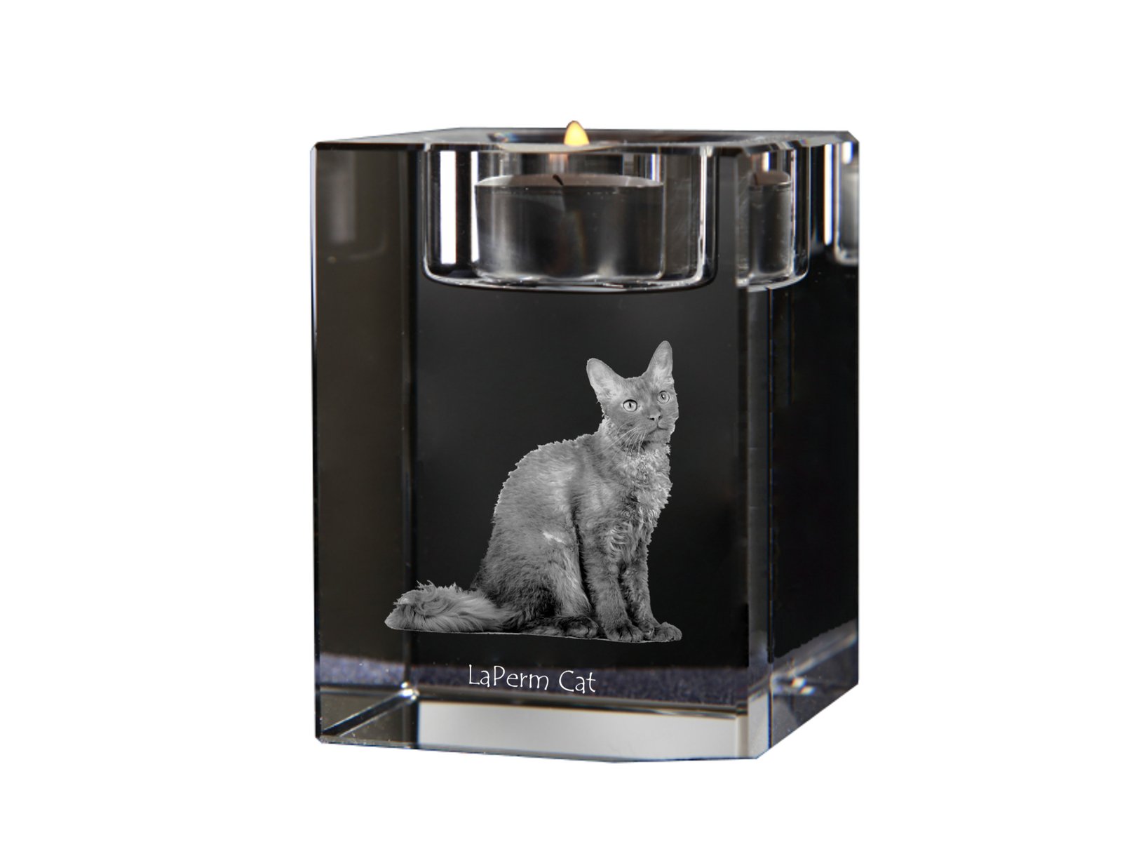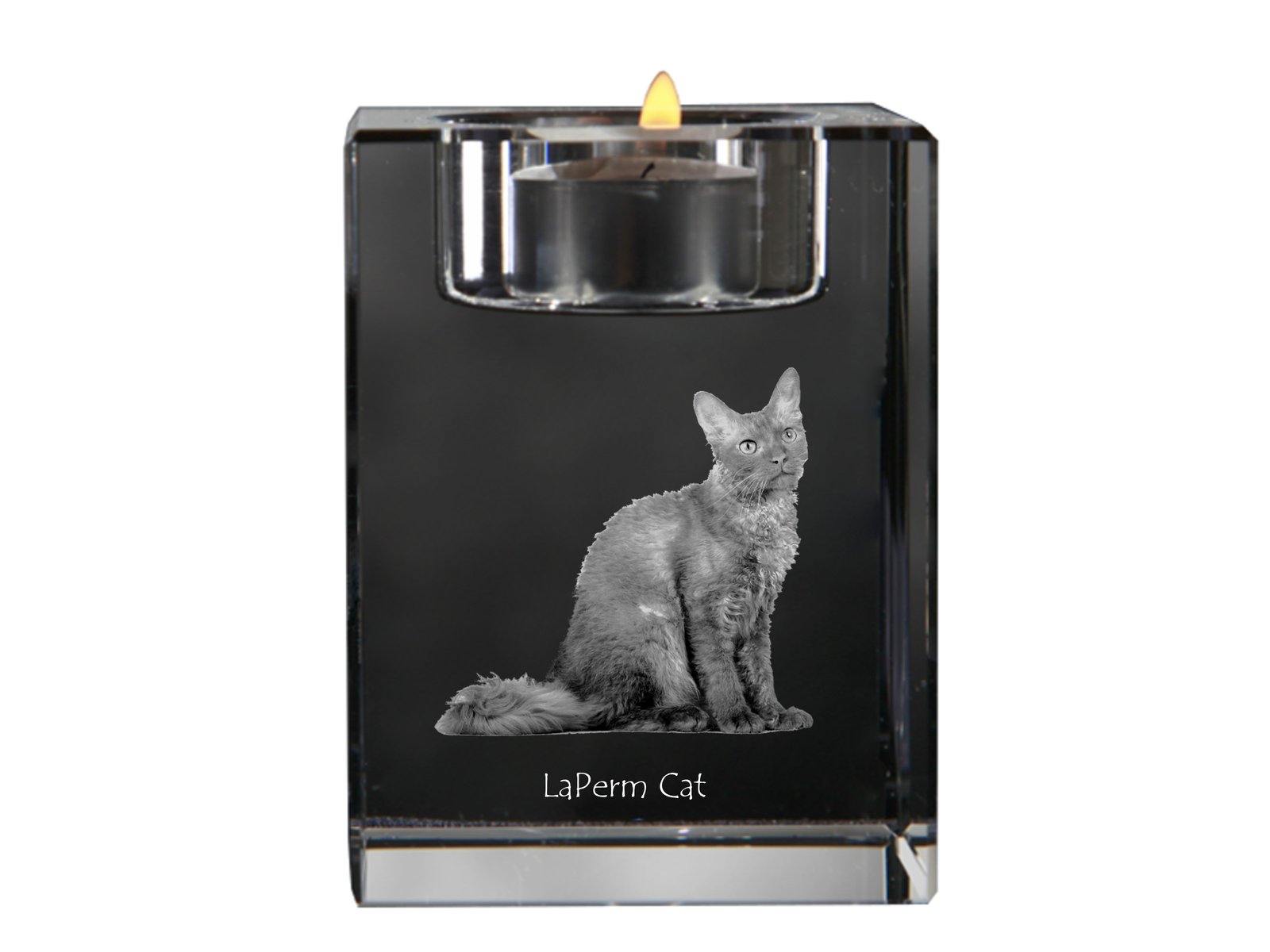 Lapermas (LaPerm) – Žvakidė su katės nuotrauka