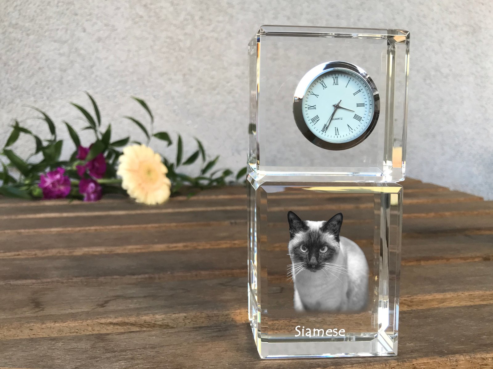 Siamo katės (Siamese)- Krištolo laikrodis su nuotrauka