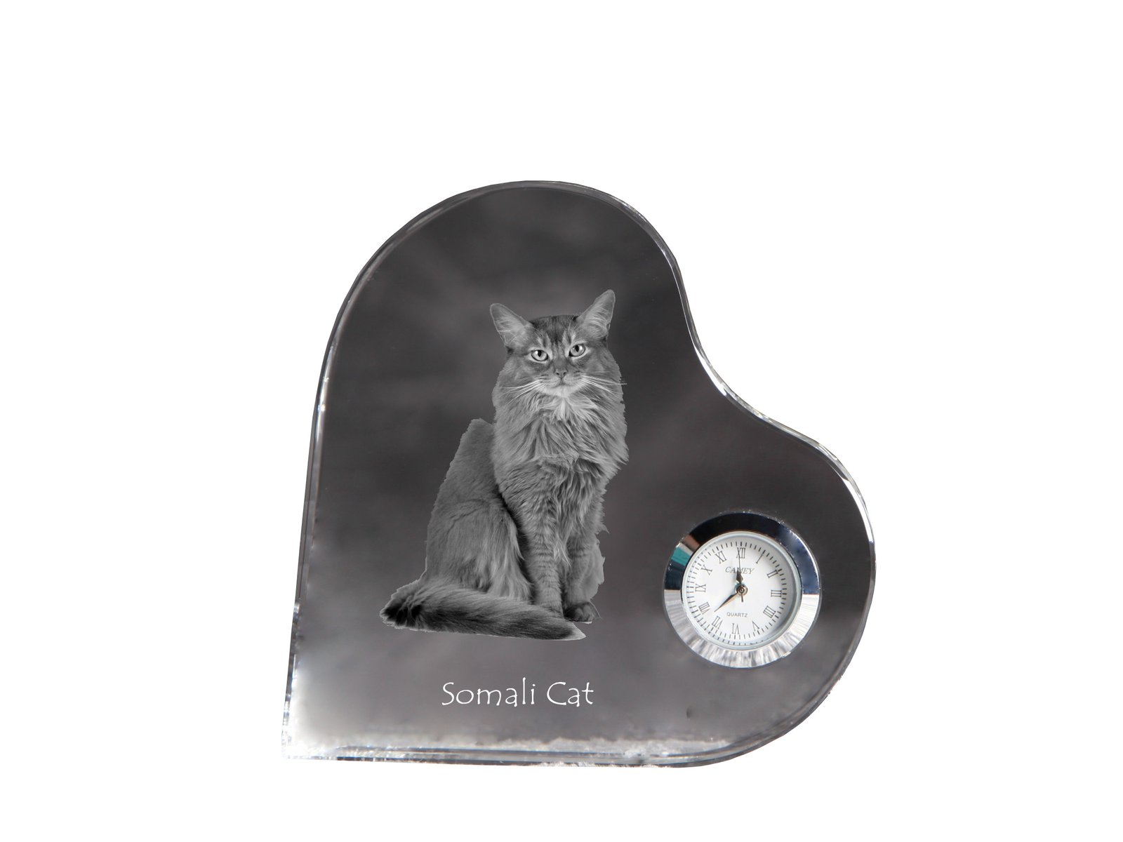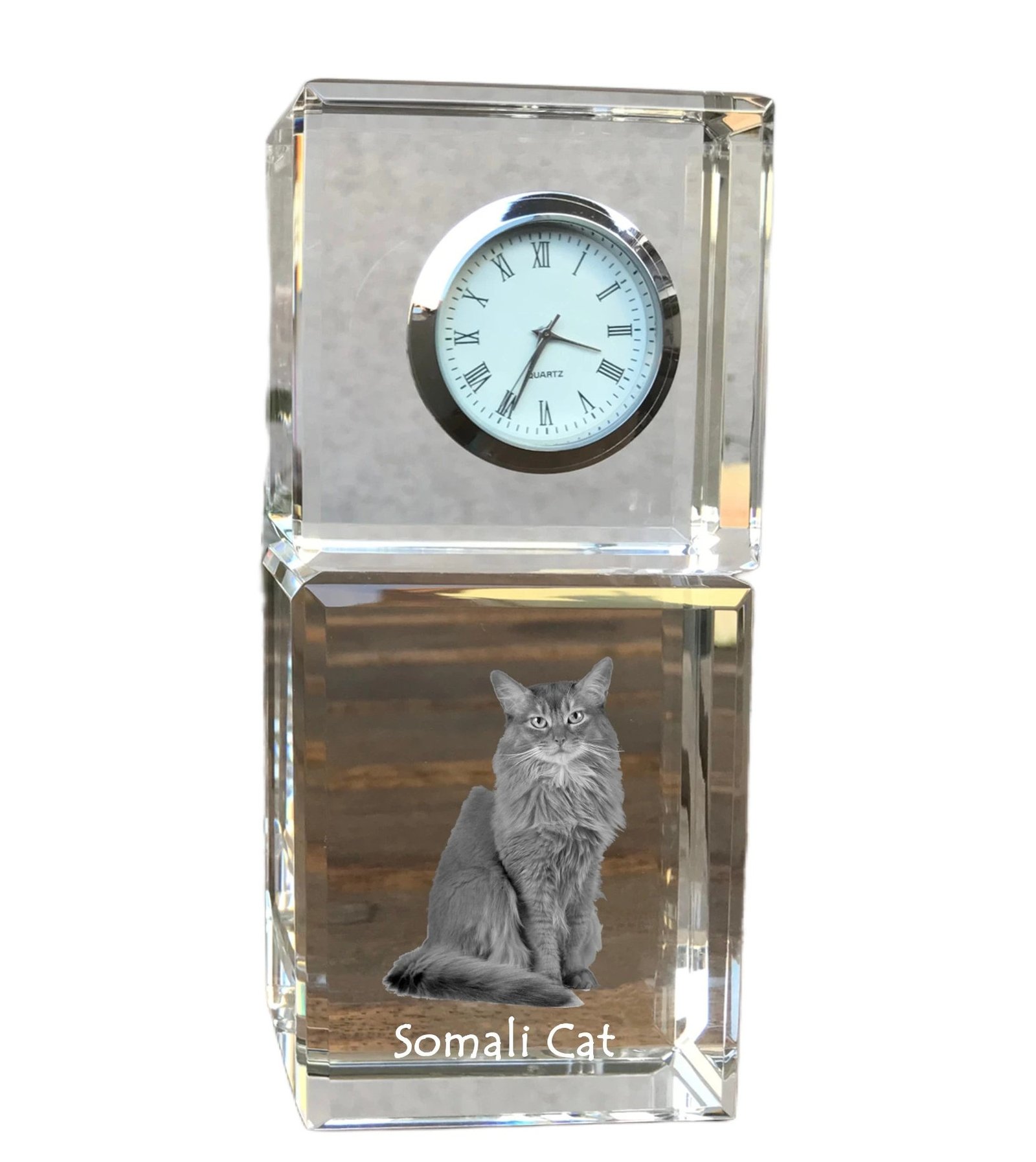 Somalio katės (Somali cat) – Krištolo laikrodis su katės nuotrauka