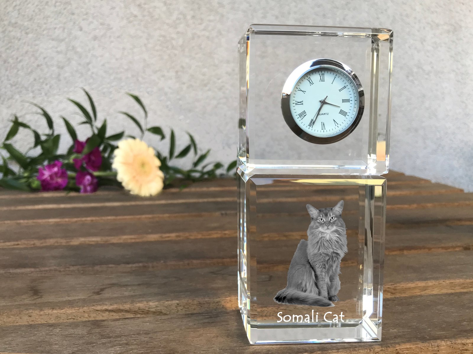 Somalio katės (Somali cat) – Krištolo laikrodis su nuotrauka