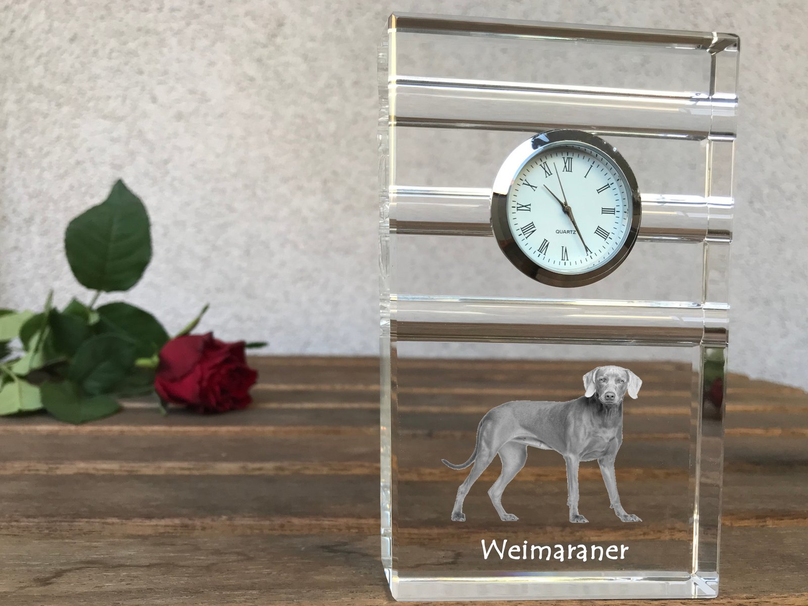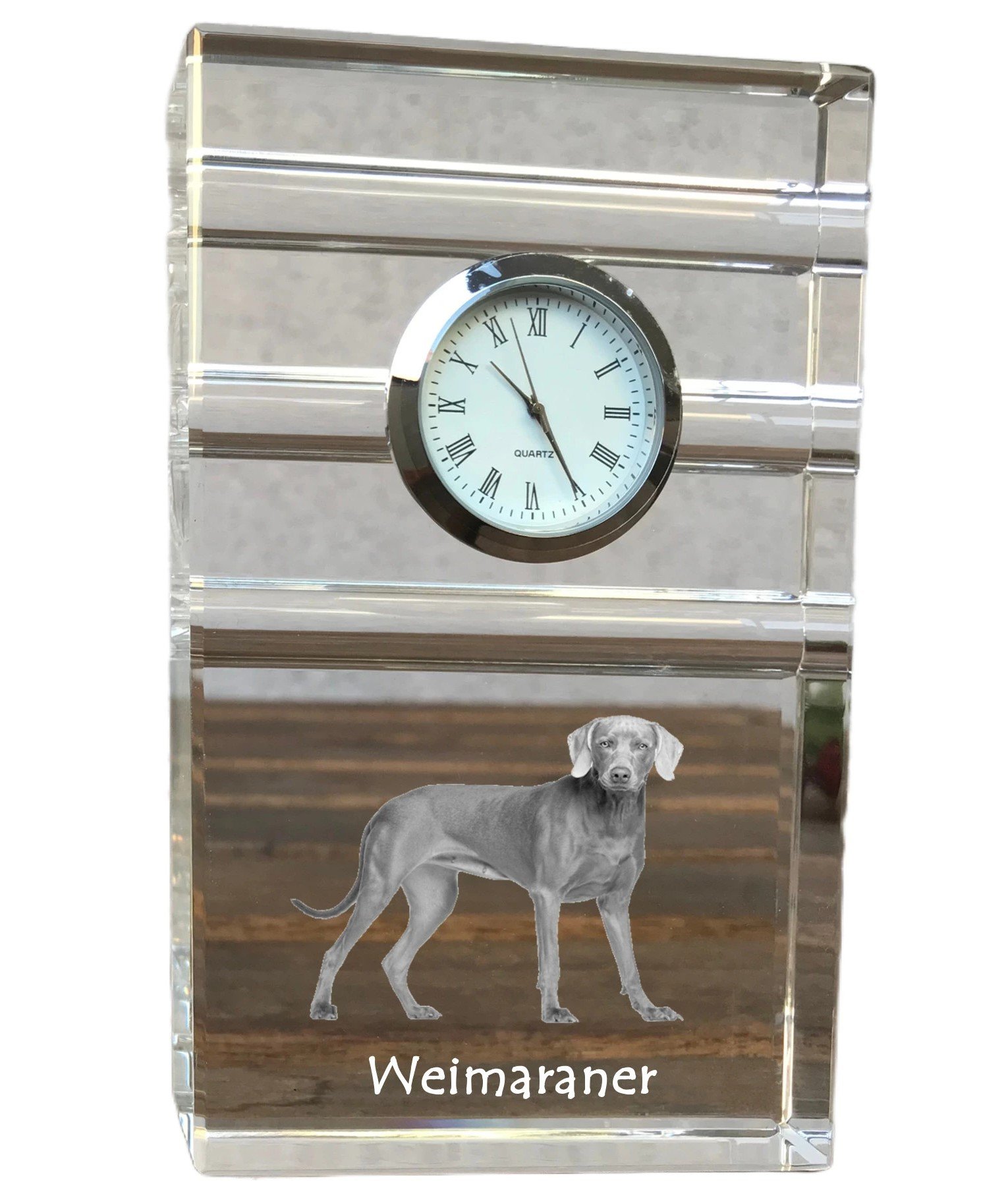 Veimaro paukštšunis (Veimaraneris, Weimaraner) – Stiklinis laikrodis su nuotrauka